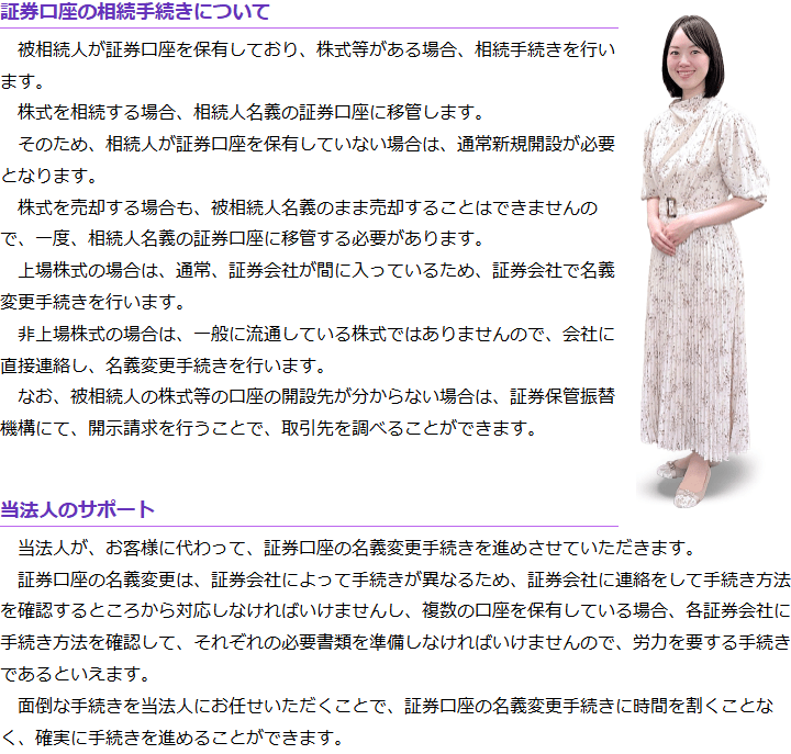 相続財産の中に株式等があり、それを相続する場合は、相続人名義の証券口座に移管する手続きが必要です。