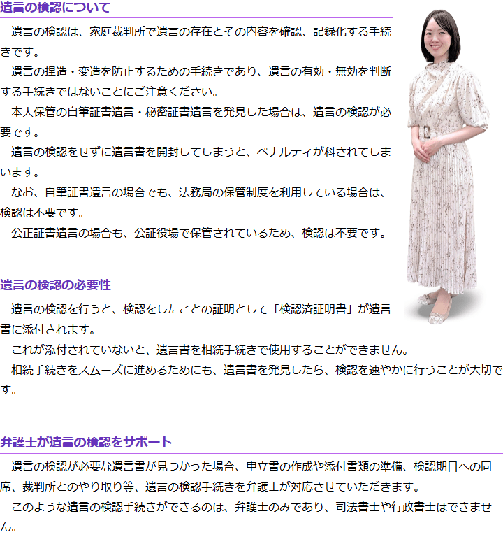 遺言の検認は、家庭裁判所で行う手続きであり、遺言の存在と内容を確認し、遺言書の偽造・変造を防止する手続きです。